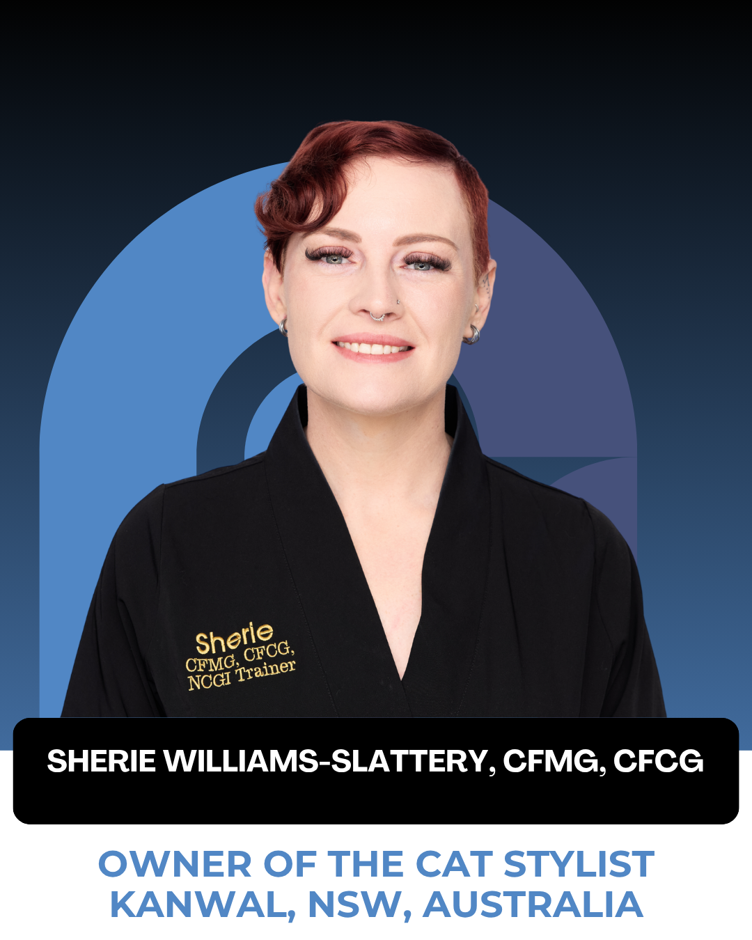 Sherie Williams-Slattery (CFMG, CFCG, Certifier), based in Sydney, Australia, transitioned to cat-exclusive grooming in 2020 and has since cultivated a loyal, membership-based clientele. Operating from a calm, private home salon, her work is defined by consistency, low-stress handling, and exceptional standards. A highly sought-after service, her business reflects a considered approach where quality, care, and sustainability are prioritised over volume.