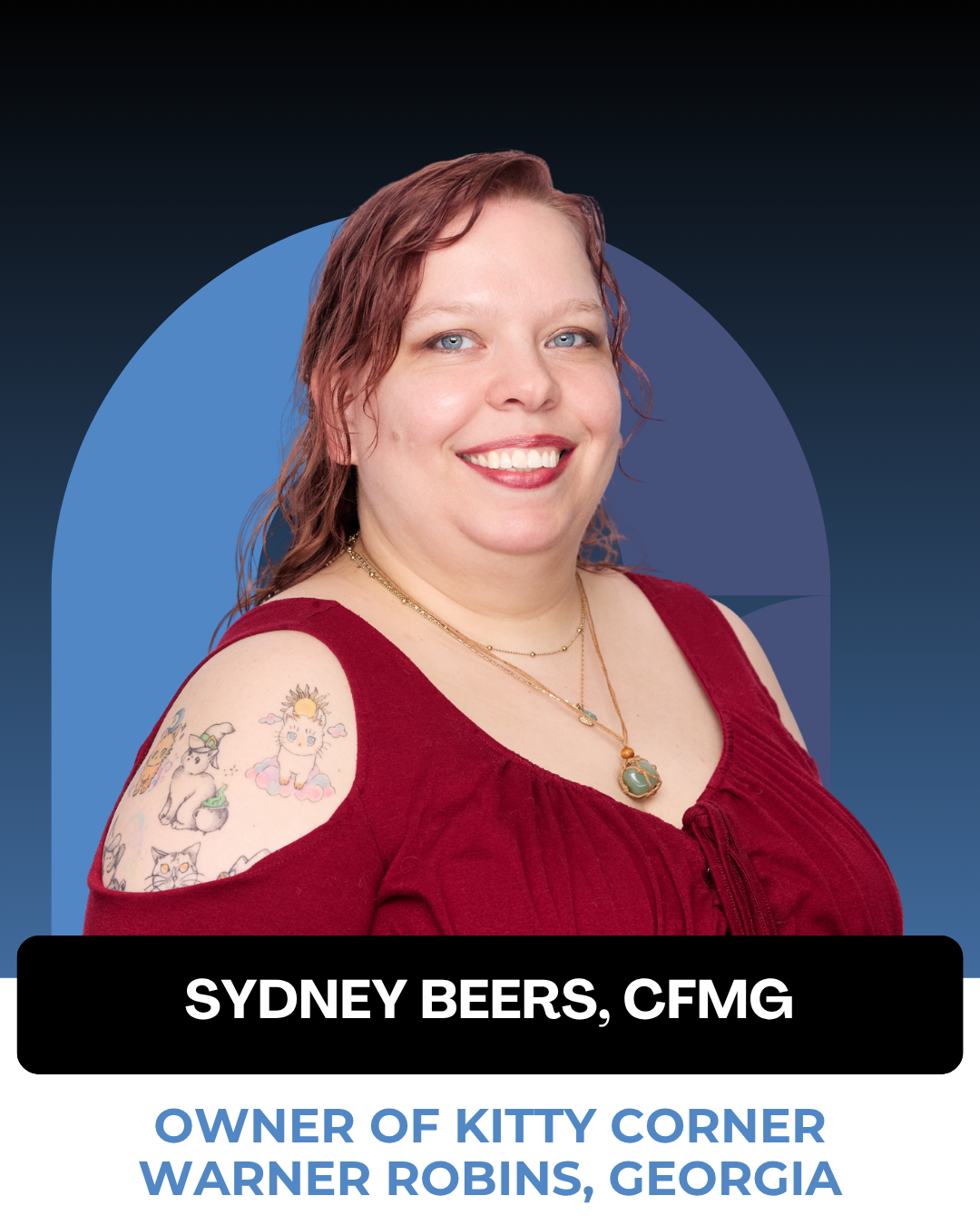 Sydney Beers is the owner of Kitty Corner Spa & Boarding, a cat-exclusive grooming and boarding facility. She has been grooming for six years, beginning her career in dog grooming before discovering her passion for feline care. Sydney launched her business in March 2025 after initially offering house call services, and earned her Certified Feline Master Groomer (CFMG) designation through NCGI in December 2025. She specializes in short coats, long coats, and comb cuts. At home, she is a proud cat mom to two Highlanders, Fox and Felix, and a long-haired bobtail named Max.